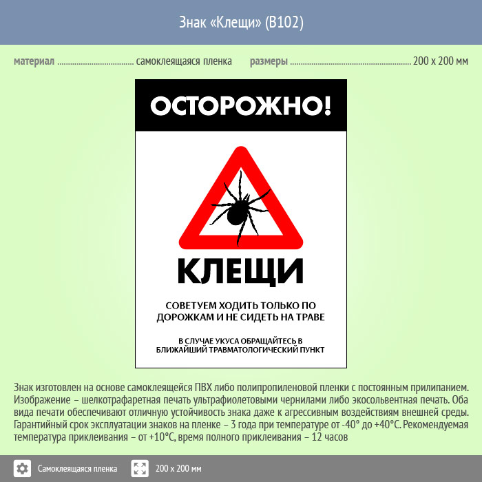 Знак «Осторожно! Клещи», B102 (пленка, 400х600 мм) в Яхроме купить