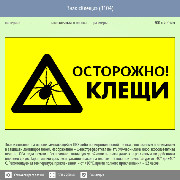 Знак «Осторожно! Клещи», B104 (пленка c ламинированием, 400х300 мм) в Яхроме купить