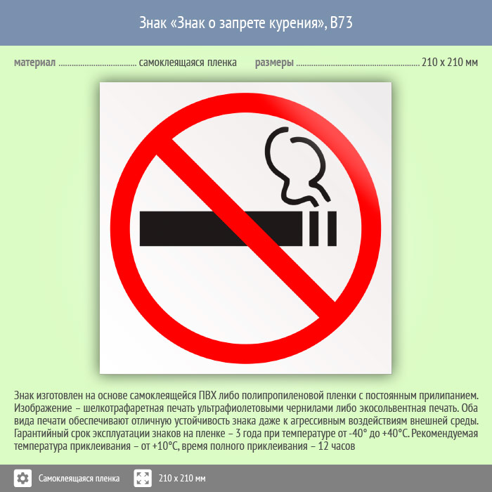 Знак «Знак о запрете курения», B73 (пленка, 210х210 мм) в Яхроме купить