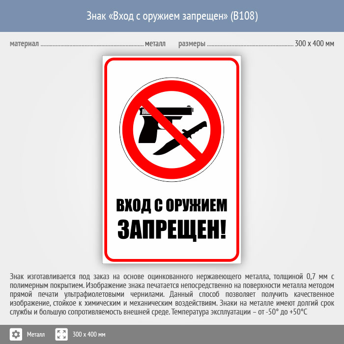 Знак «Вход с оружием запрещен», B108 (металл, 300х400 мм) в Яхроме купить