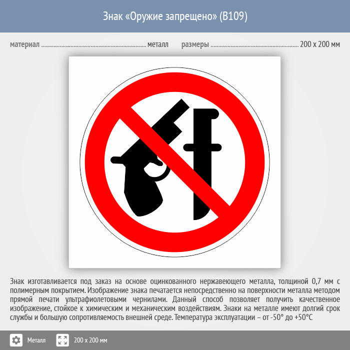 Знак «Оружие запрещено», B109 (металл, 200х200 мм) в Яхроме купить