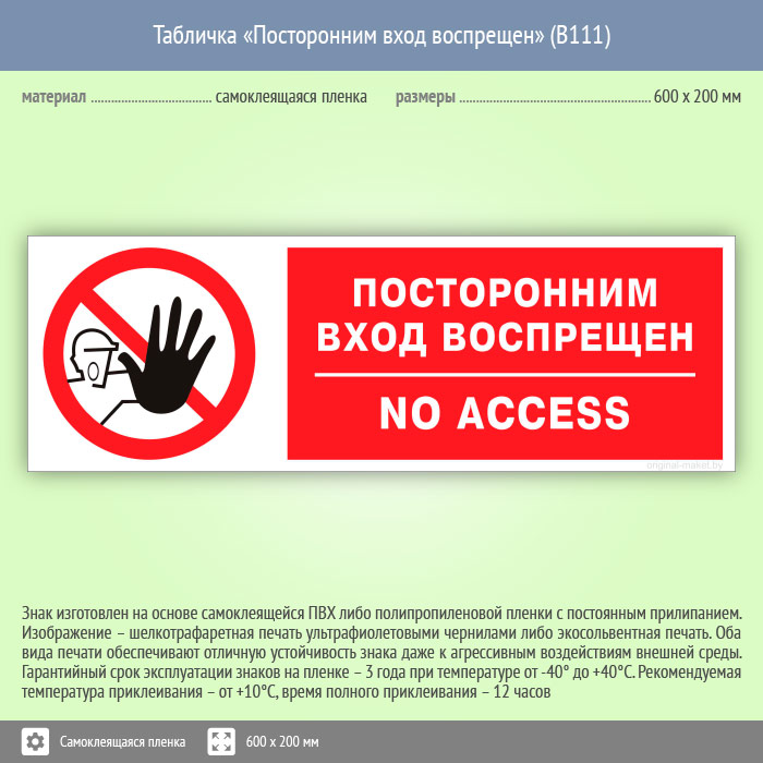 Табличка «Посторонним вход воспрещен», B111 (пленка, 600х200 мм) в Яхроме купить