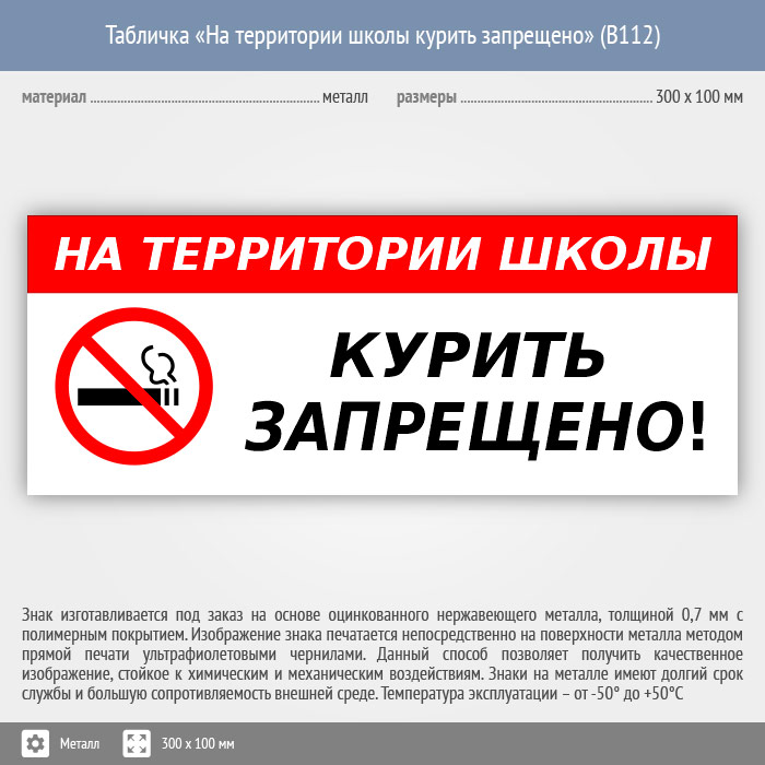 Табличка «На территории школы курить запрещено», B112 (металл, 300х100 мм) в Яхроме купить