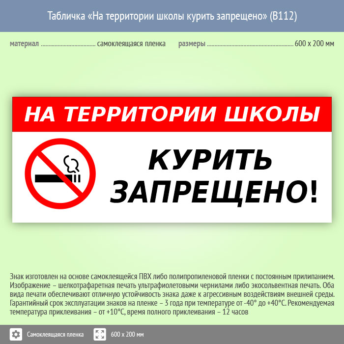 Табличка «На территории школы курить запрещено», B112 (пленка, 600х200 мм) в Яхроме купить