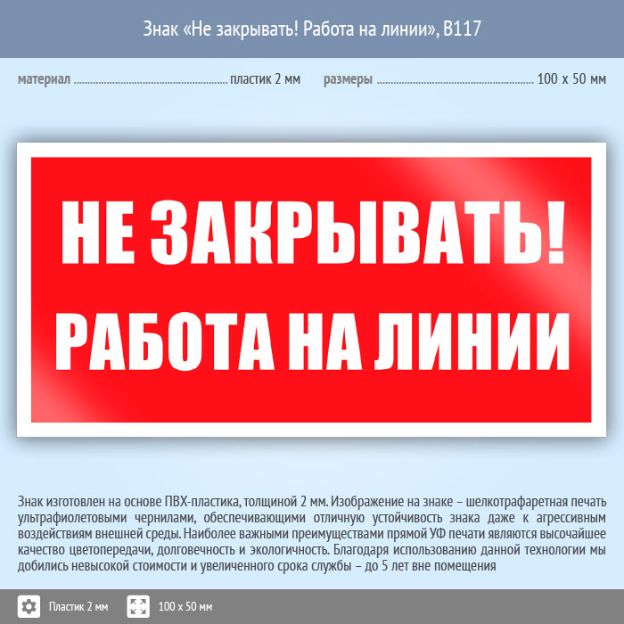 Знак «Не закрывать! Работа на линии», B117 (пластик, 100х50 мм) в Яхроме купить