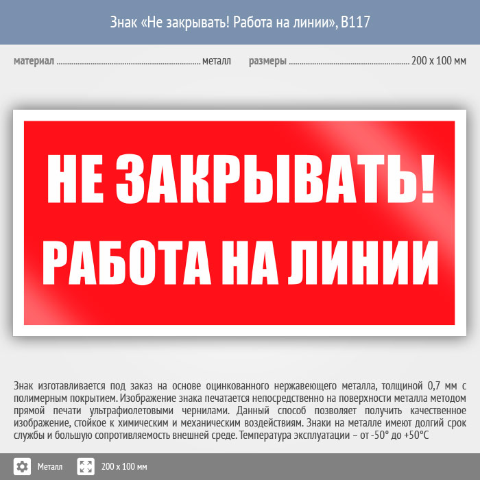 Знак «Не закрывать! Работа на линии», B117 (металл, 200х100 мм) в Яхроме купить