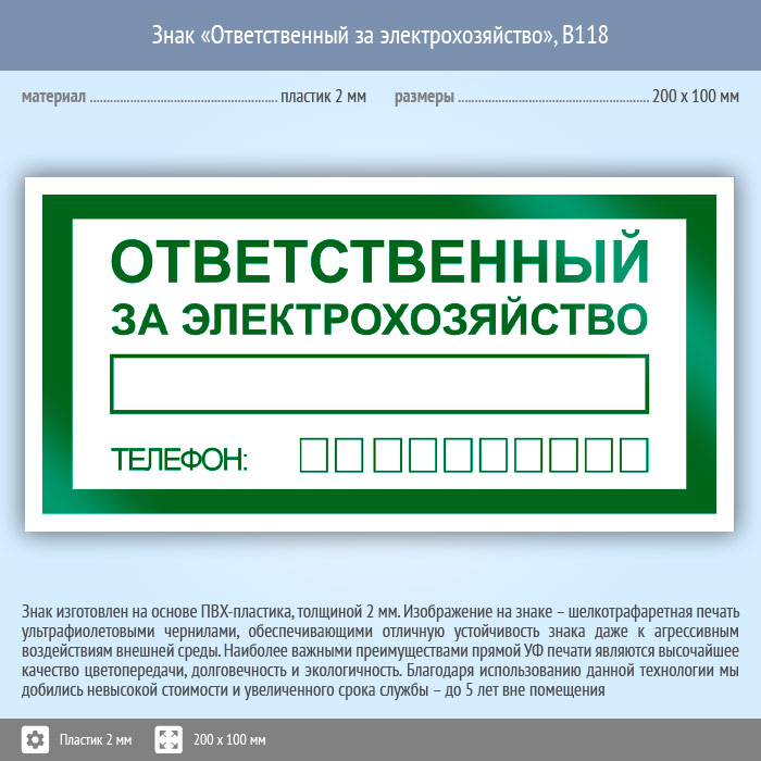 Знак «Ответственный за электрохозяйство», B118 (пластик, 200х100 мм) в Яхроме купить