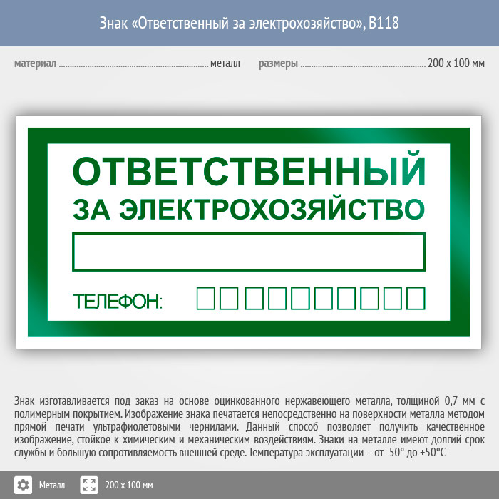 Знак «Ответственный за электрохозяйство», B118 (металл, 200х100 мм) в Яхроме купить