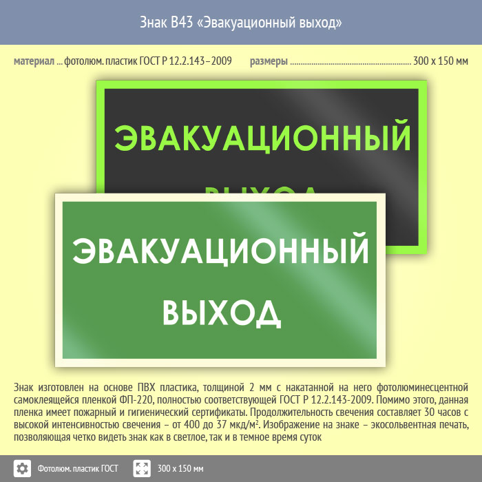 Знак B43 «Эвакуационный выход» (фотолюминесцентный пластик ГОСТ 34428-2018, 300х150 мм) в Яхроме купить