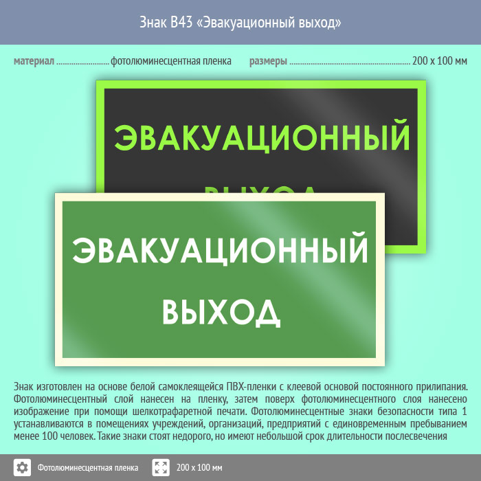 Знак B43 «Эвакуационный выход» (фотолюминесцентная пленка ГОСТ 34428-2018, 200х100 мм) в Яхроме купить