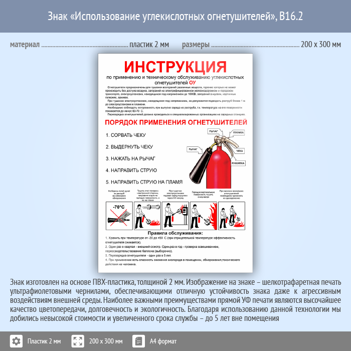 Знак «Использование углекислотных огнетушителей», B16.2 (пластик, 200х300 мм) в Яхроме купить