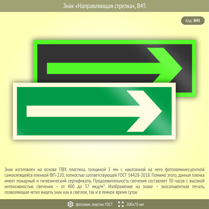 Знак «Направляющая стрелка», B45 (фотолюминесцентный пластик ГОСТ 34428-2018, 200х70 мм) в Яхроме купить
