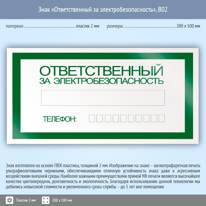 Знак «Ответственный за электробезопасность», B02 (пластик, 200х100 мм) в Яхроме купить