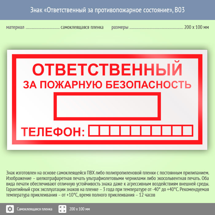 Знак «Ответственный за пожарную безопасность», B03 (пленка, 200х100 мм) в Яхроме купить