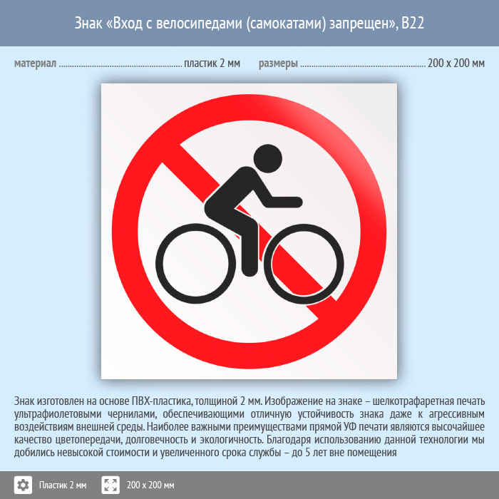 Знак «Вход с велосипедами (самокатами) запрещен», B22 (пластик, 200х200 мм) в Яхроме купить