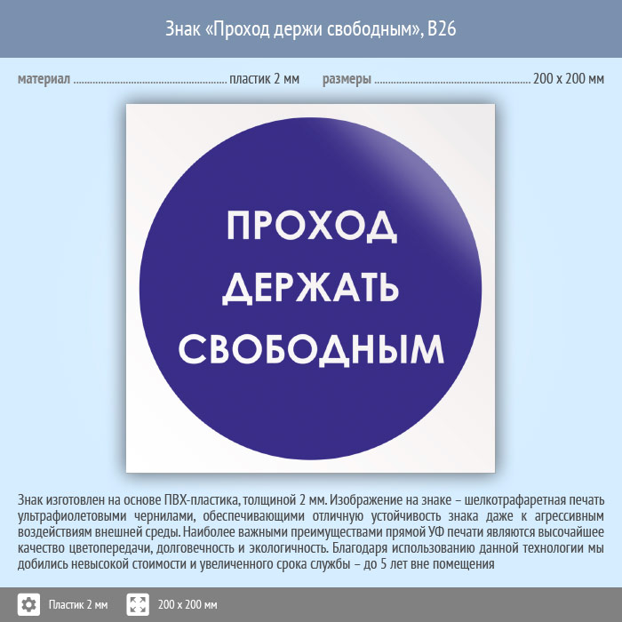 Знак «Проход держи свободным», B26 (пластик, 200х200 мм) в Яхроме купить