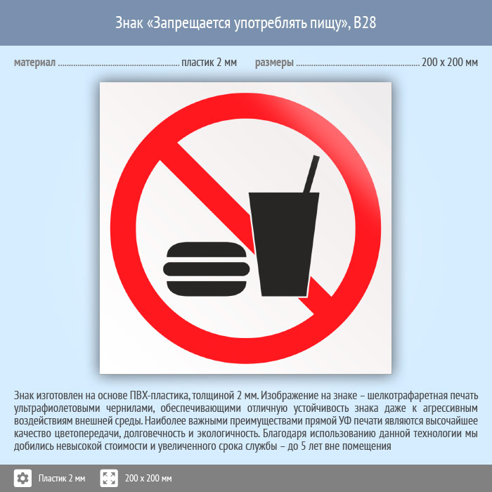 Знак «Запрещается употреблять пищу», B28 (пластик, 200х200 мм) в Яхроме купить