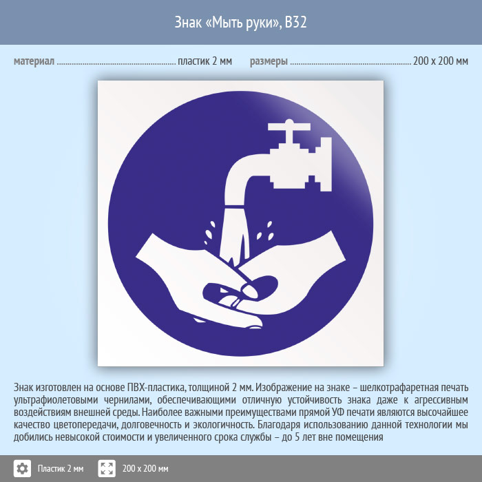 Знак «Мыть руки», B32 (пластик, 200х200 мм) в Яхроме купить