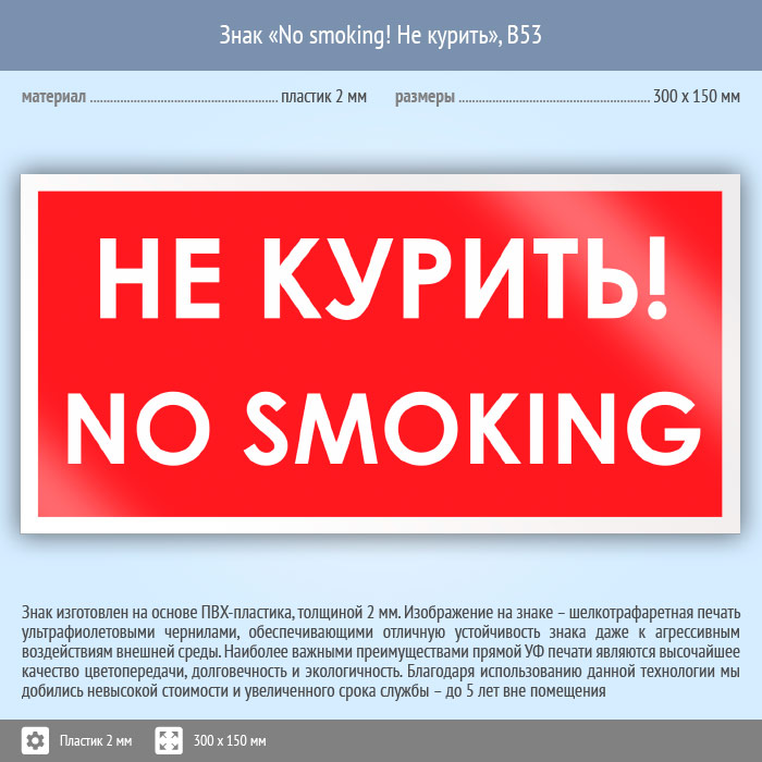 Знак «No smoking! Не курить», B53 (пластик, 300х150 мм) в Яхроме купить