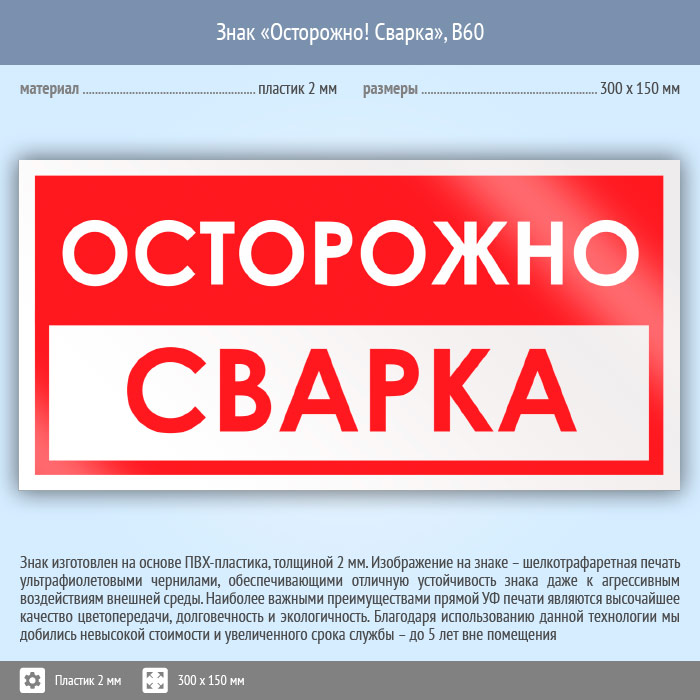 Знак «Осторожно! Сварка», B60 (пластик, 300х150 мм) в Яхроме купить