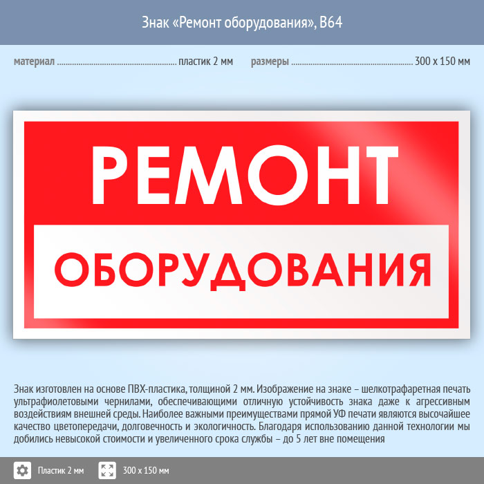 Знак «Ремонт оборудования», B64 (пластик, 300х150 мм) в Яхроме купить