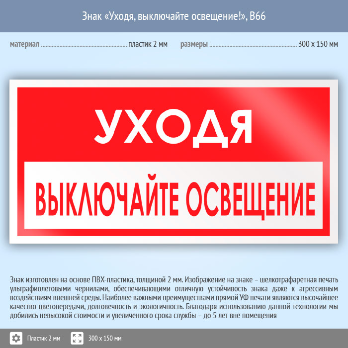 Знак «Уходя, выключайте освещение!», B66 (пластик, 300х150 мм) в Яхроме купить