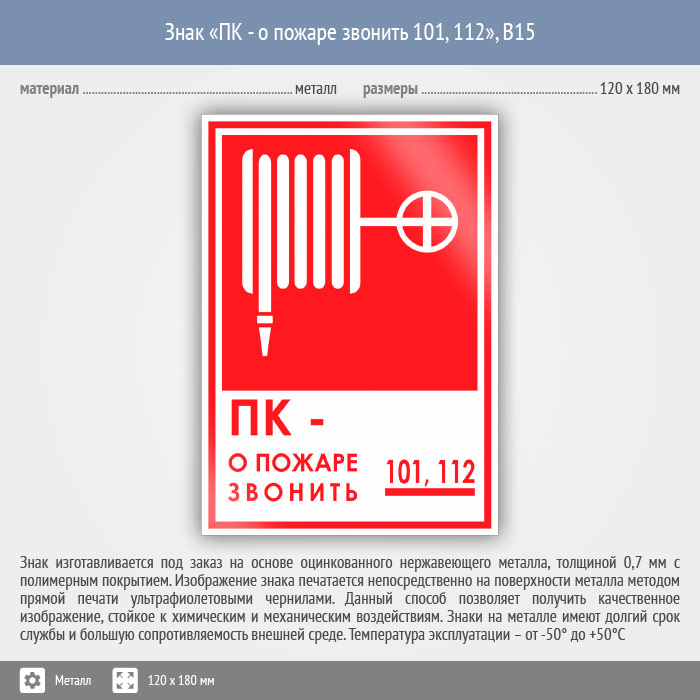 Знак «ПК - о пожаре звонить 101, 112», B15 (металл, 120х180 мм) в Яхроме купить
