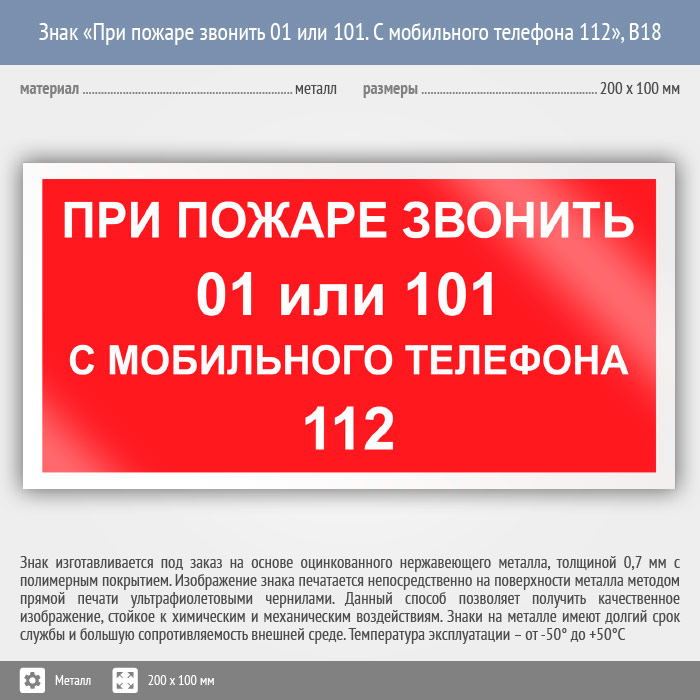 Знак «При пожаре звонить 01 или 101. С мобильного телефона 112», B18 (металл, 200х100 мм) в Яхроме купить