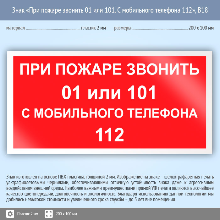 Знак «При пожаре звонить 01 или 101. С мобильного телефона 112», B18 (пластик, 200х100 мм) в Яхроме купить