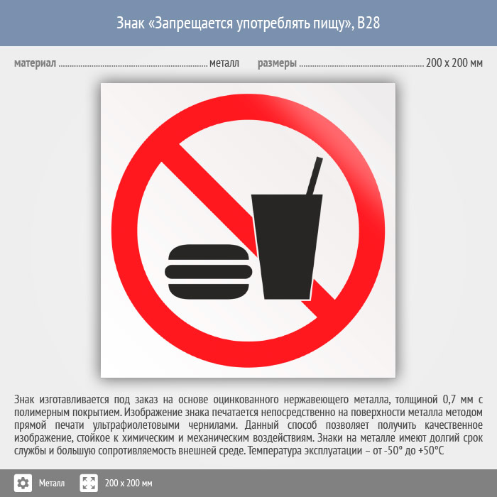 Знак «Запрещается употреблять пищу», B28 (металл, 200х200 мм) в Яхроме купить