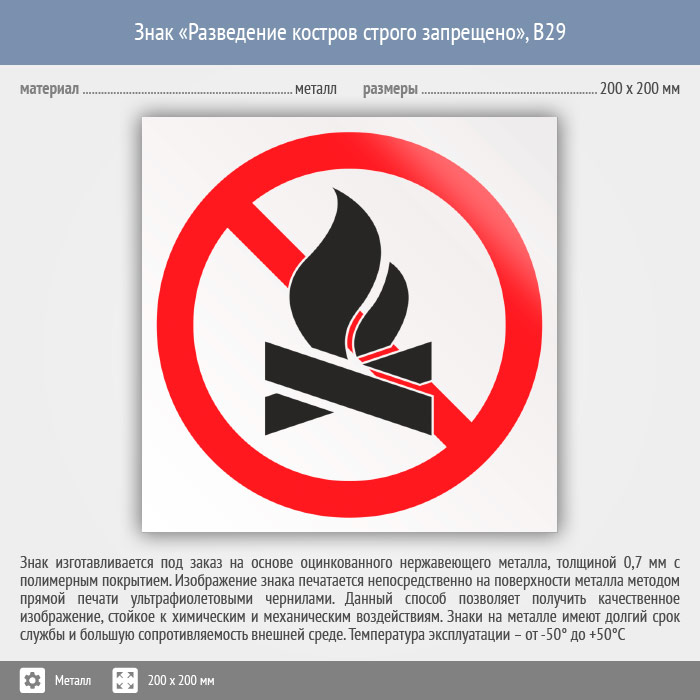Знак «Разведение костров строго запрещено», B29 (металл, 200х200 мм) в Яхроме купить