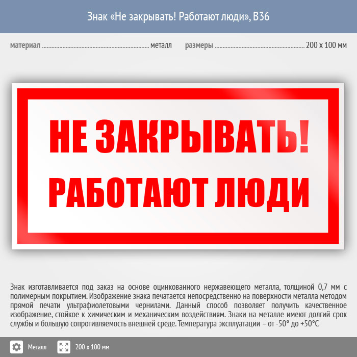 Знак «Не закрывать! Работают люди», B36 (металл, 200х100 мм) в Яхроме купить