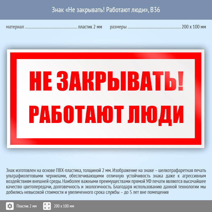 Знак «Не закрывать! Работают люди», B36 (пластик, 200х100 мм) в Яхроме купить