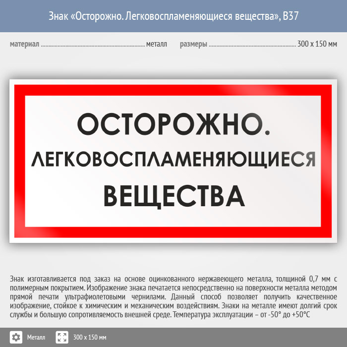 Знак «Осторожно. Легковоспламеняющиеся вещества», B37 (металл, 300х150 мм) в Яхроме купить
