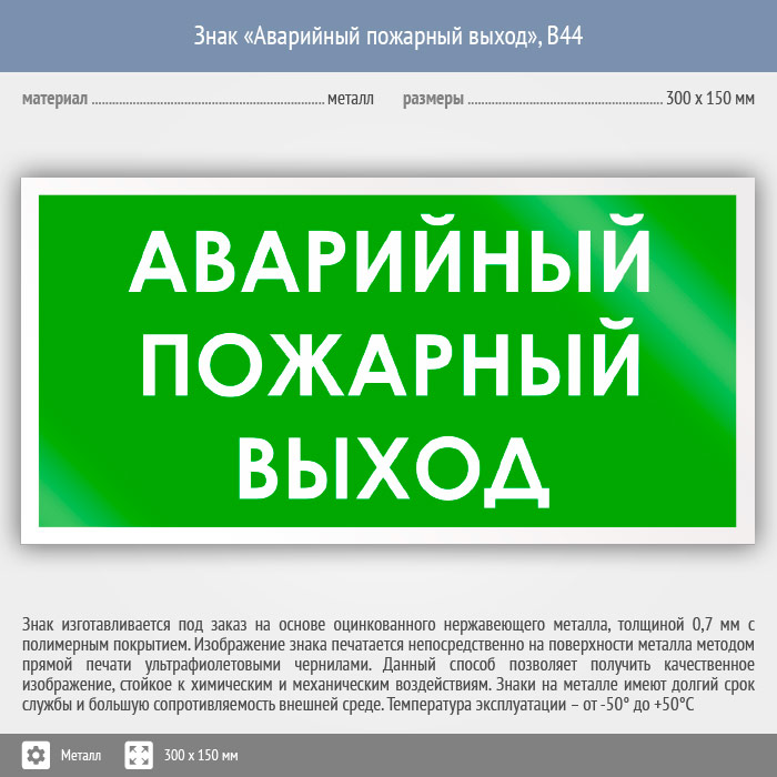 Знак «Аварийный пожарный выход», B44 (металл, 300х150 мм) в Яхроме купить