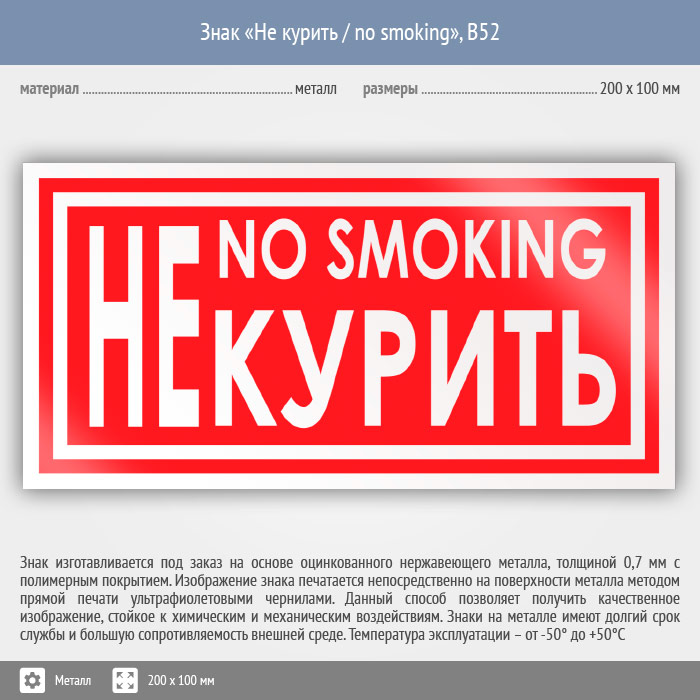 Знак «Не курить / no smoking», B52 (металл, 200х100 мм) в Яхроме купить