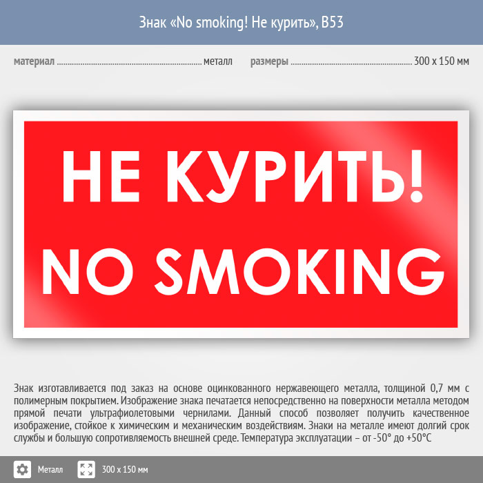 Знак «No smoking! Не курить», B53 (металл, 300х150 мм) в Яхроме купить