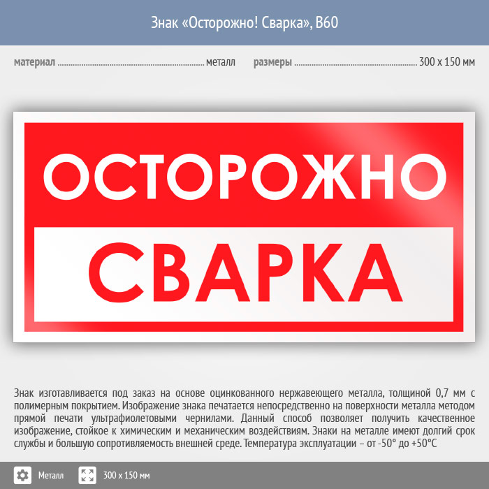 Знак «Осторожно! Сварка», B60 (металл, 300х150 мм) в Яхроме купить