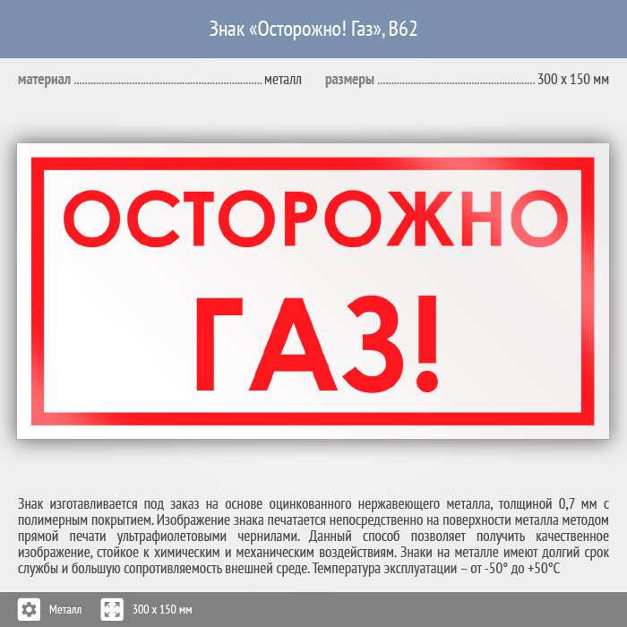Знак «Осторожно! Газ», B62 (металл, 300х150 мм) в Яхроме купить