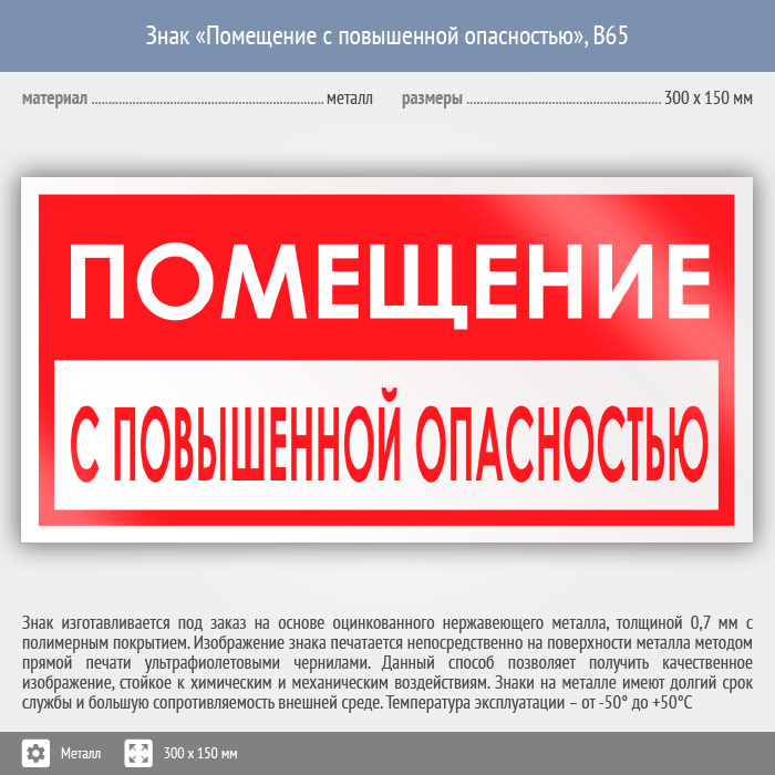 Знак «Помещение с повышенной опасностью», B65 (металл, 300х150 мм) в Яхроме купить