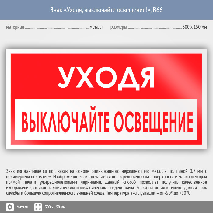Знак «Уходя, выключайте освещение!», B66 (металл, 300х150 мм) в Яхроме купить