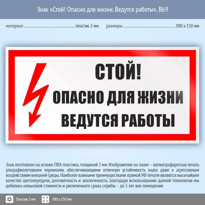 Знак «Стой! Опасно для жизни. Ведутся работы», B69 (пластик, 300х150 мм) в Яхроме купить