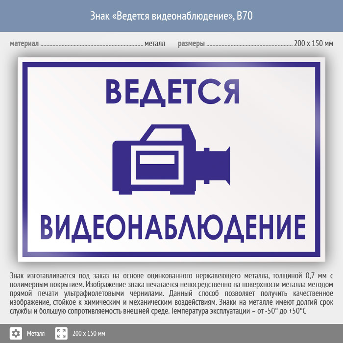 Знак «Ведется видеонаблюдение», B70 (металл, 200х150 мм) в Яхроме купить