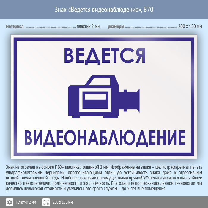 Знак «Ведется видеонаблюдение», B70 (пластик, 200х150 мм) в Яхроме купить