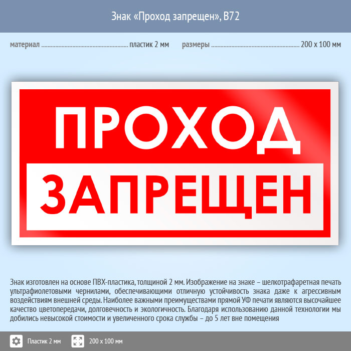 Знак «Проход запрещен», B72 (пластик, 200х100 мм) в Яхроме купить