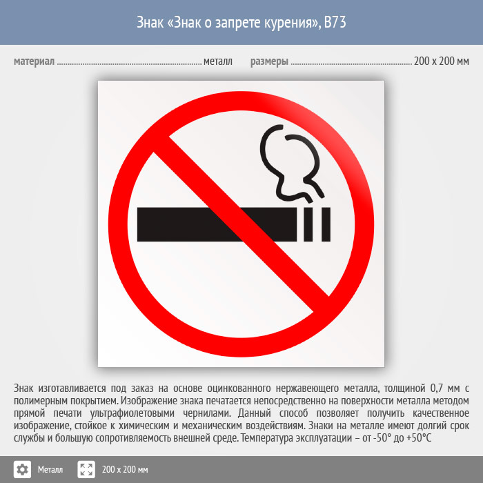 Знак «Знак о запрете курения», B73 (металл, 200х200 мм) в Яхроме купить
