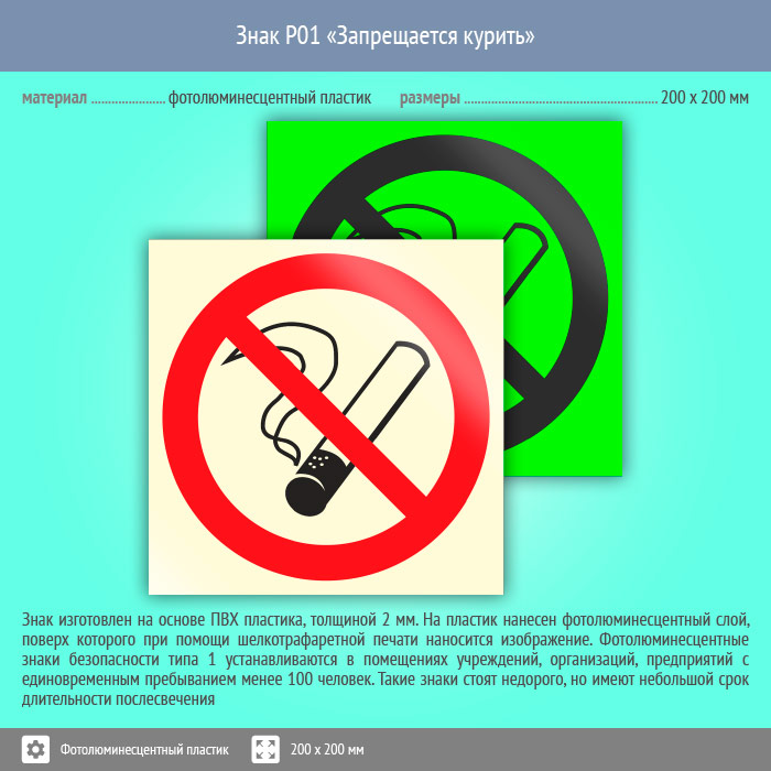 Знак P01 «Запрещается курить» (фотолюминесцентный пластик, 200х200 мм) в Яхроме купить