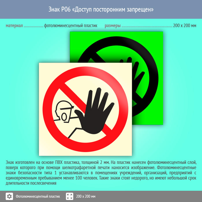 Знак P06 «Доступ посторонним запрещен» (фотолюминесцентный пластик, 200х200 мм) в Яхроме купить