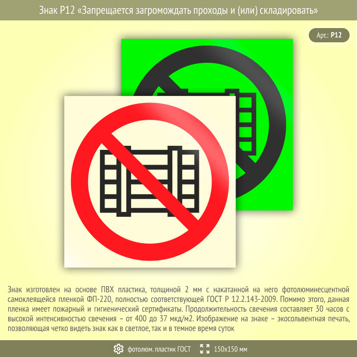 Знак P12 «Запрещается загромождать проходы и (или) складировать» (фотолюминесцентный пластик ГОСТ 34428-2018, 150х150 мм) в Яхроме купить