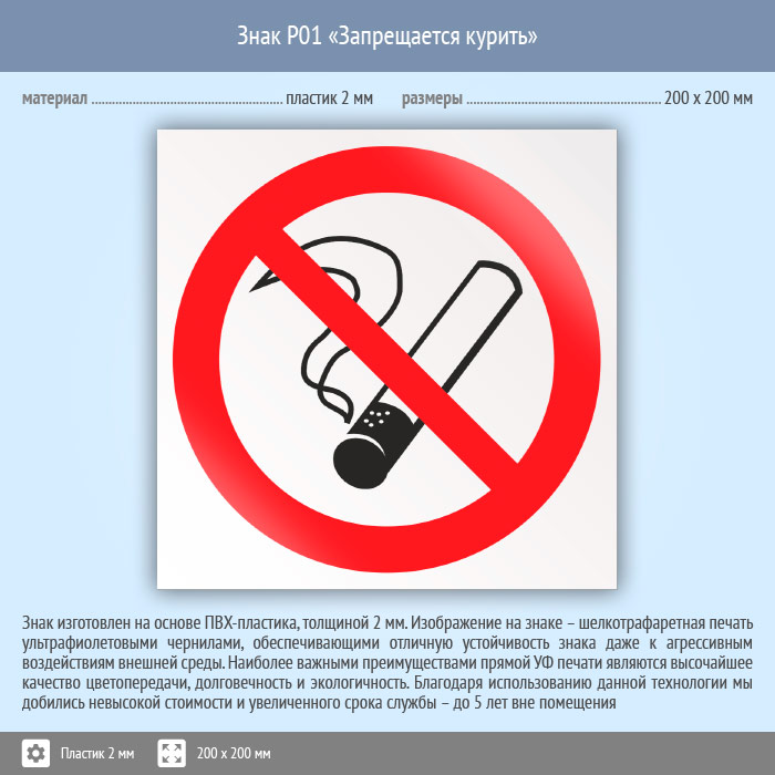 Знак P01 «Запрещается курить» (пластик, 200х200 мм) в Яхроме купить